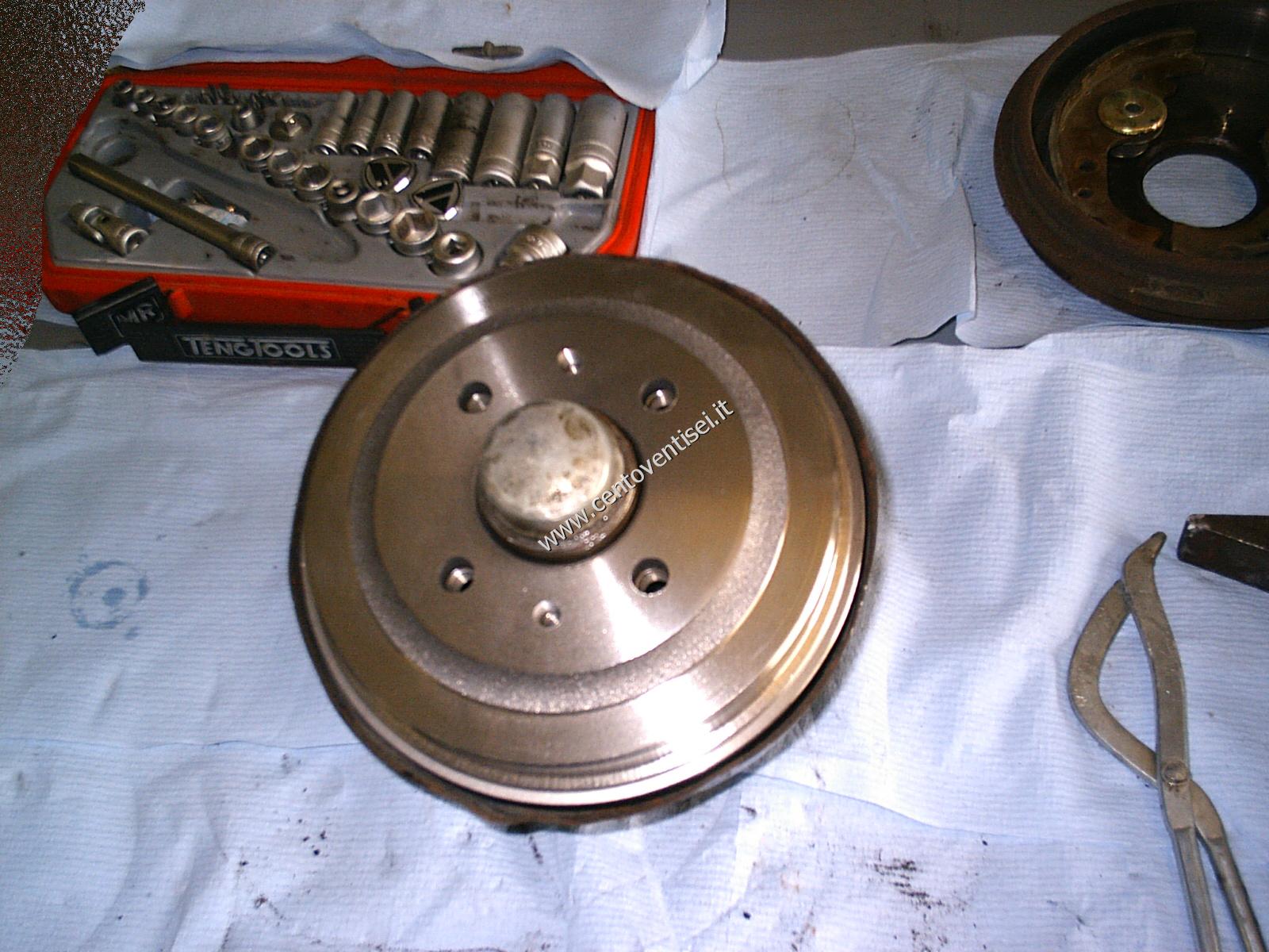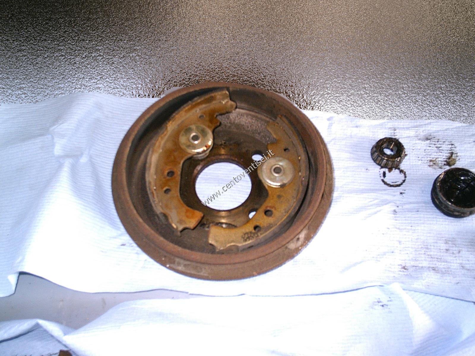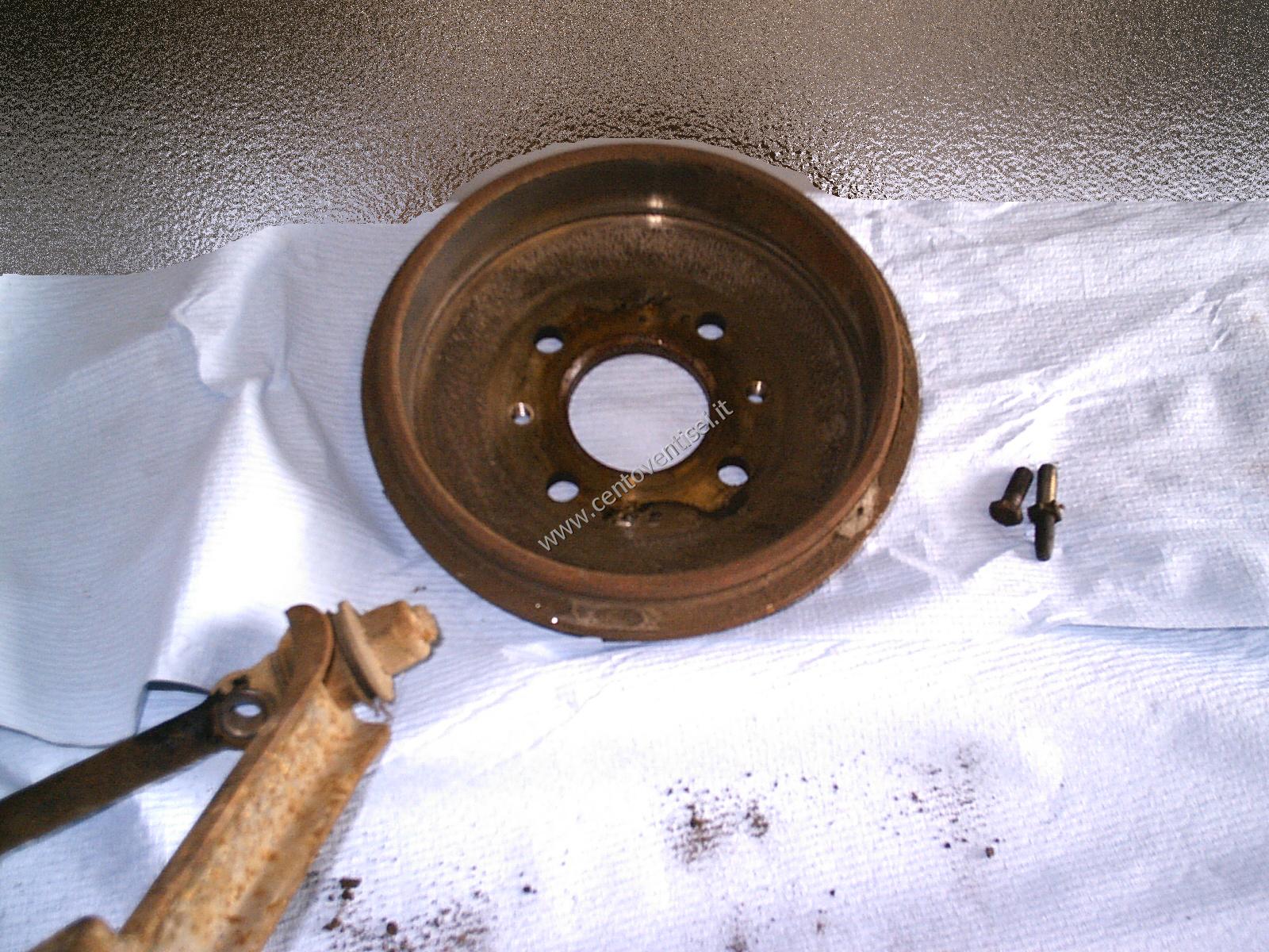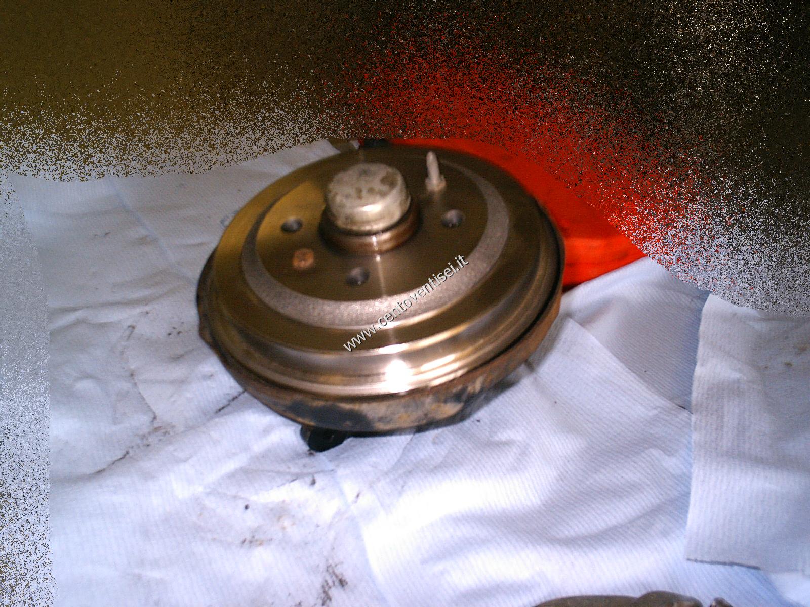 Togliamo il tamburo, fissato con 2 viti (chiave da 12mm). Ecco cosa vediamo.