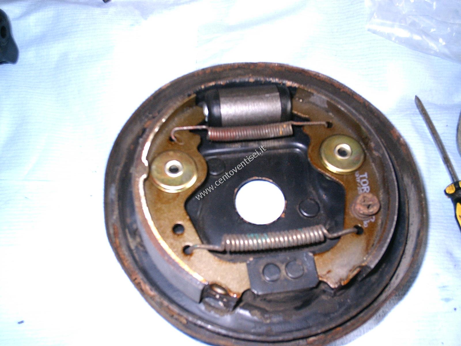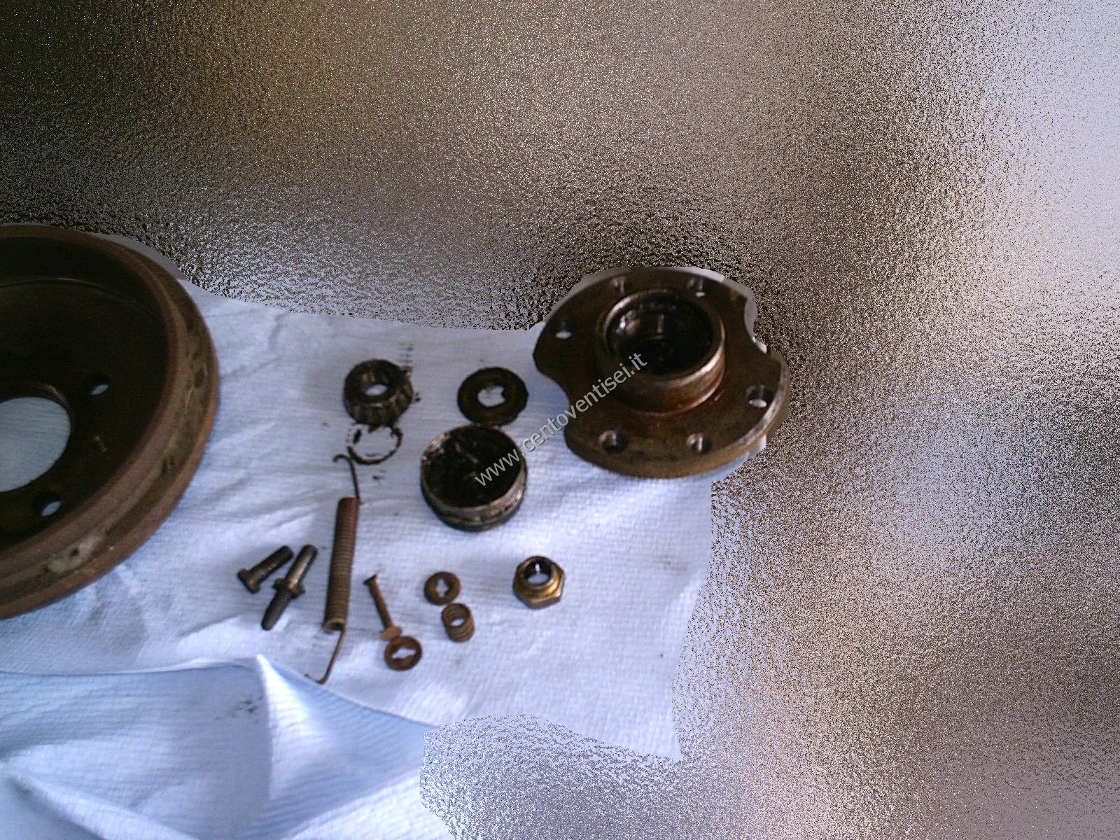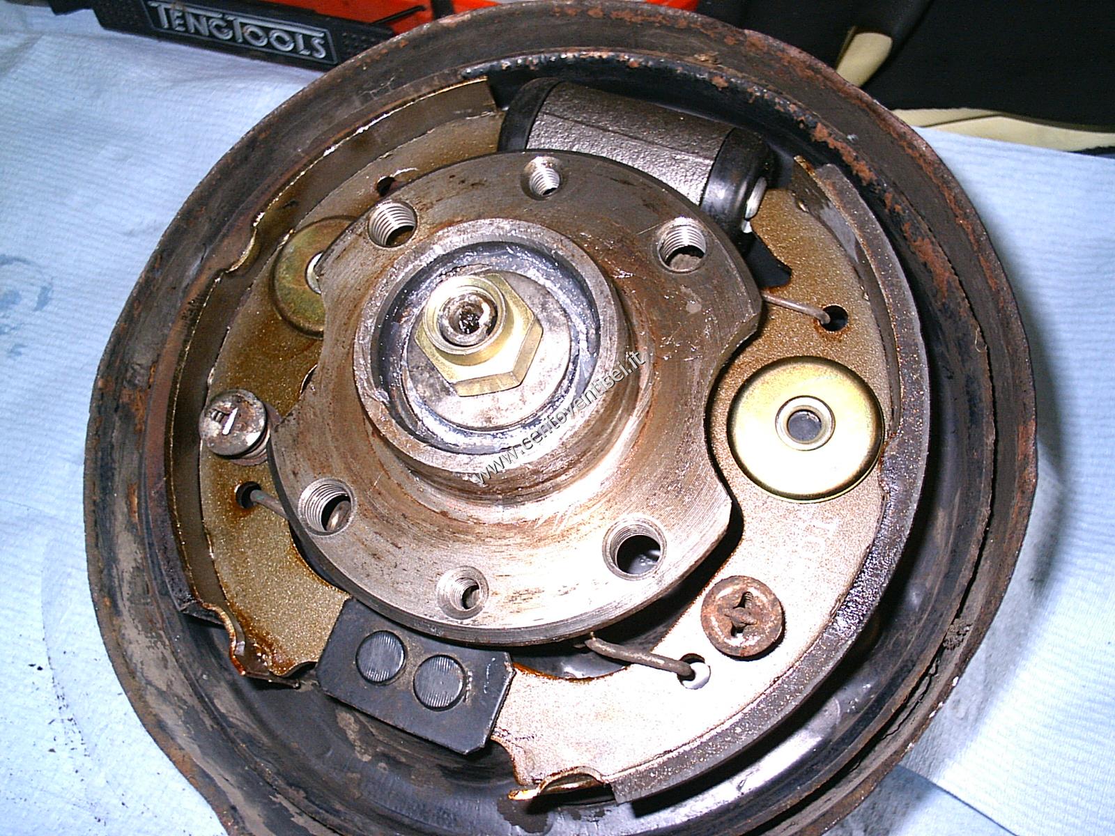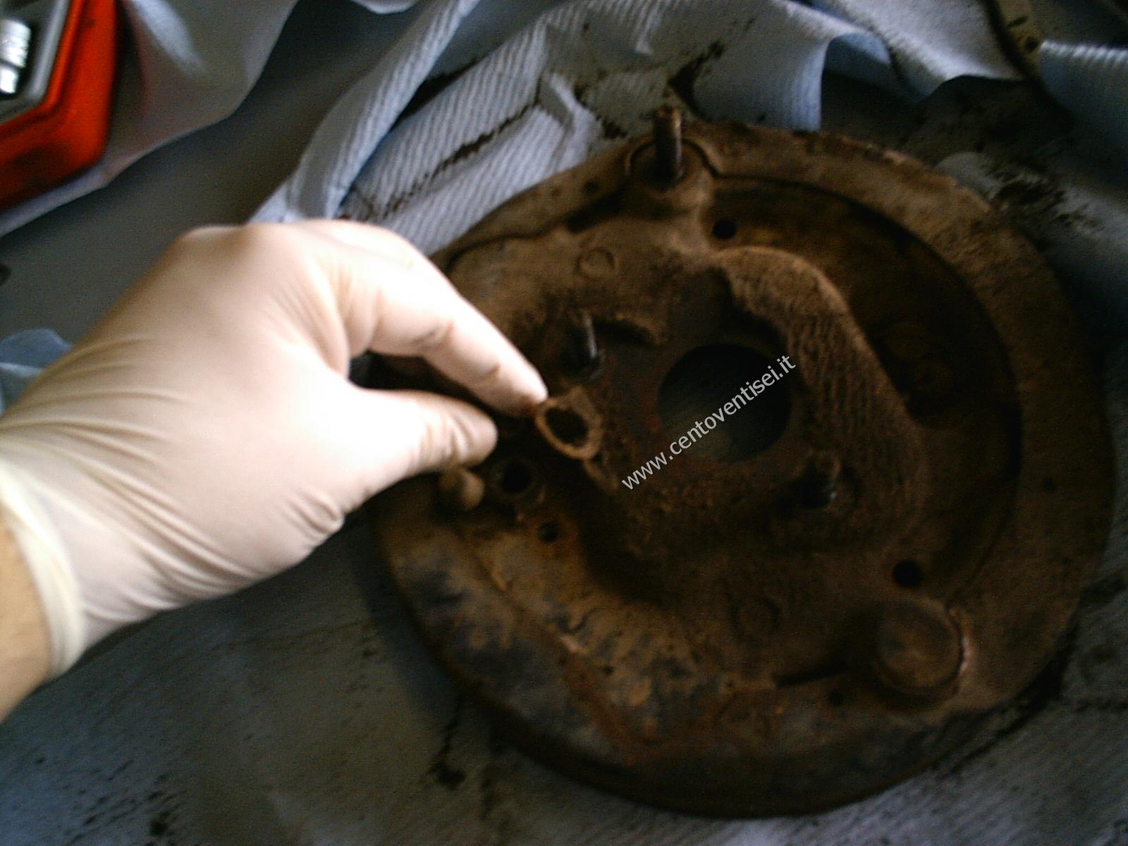 Togliamo il tamburo, fissato con 2 viti (chiave da 12mm). Ecco cosa vediamo.