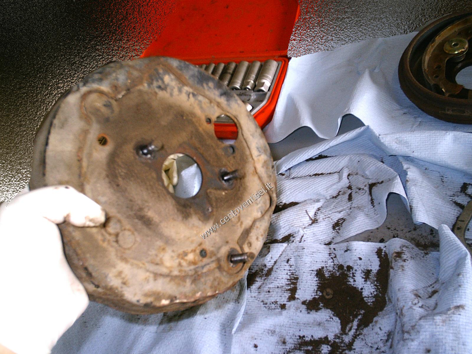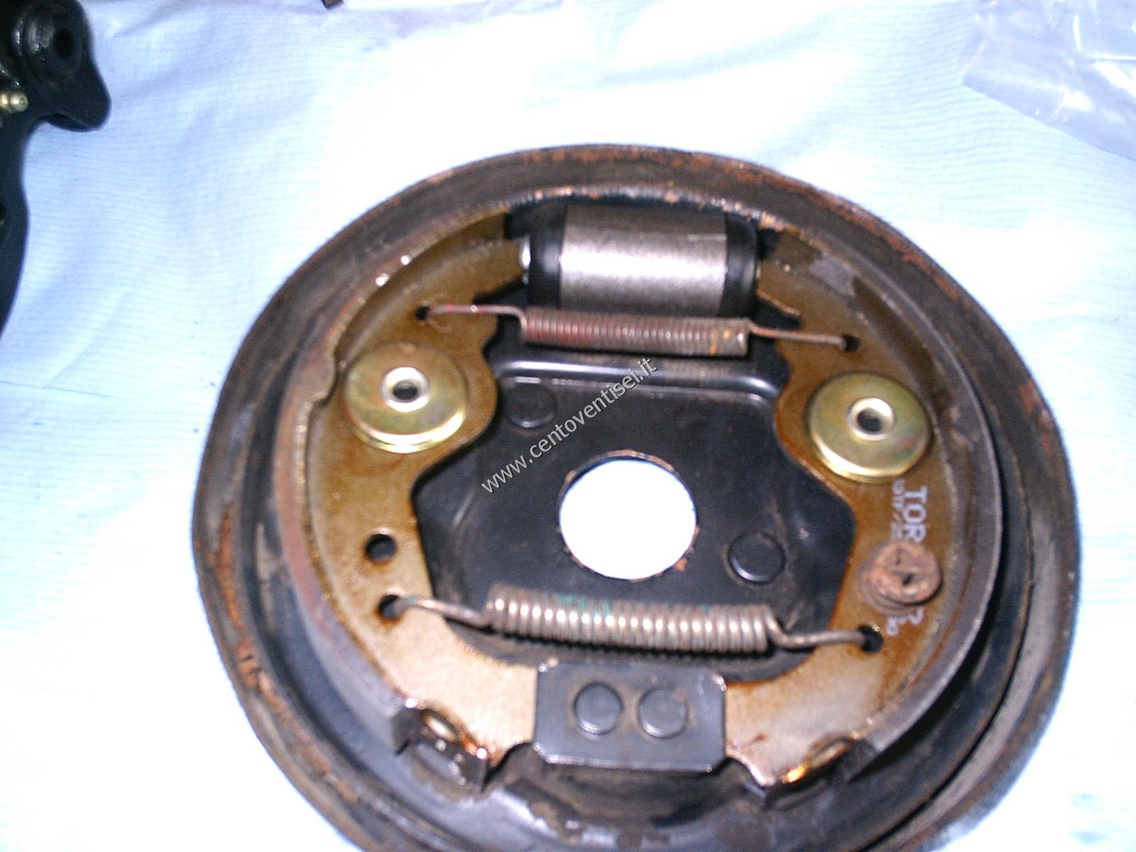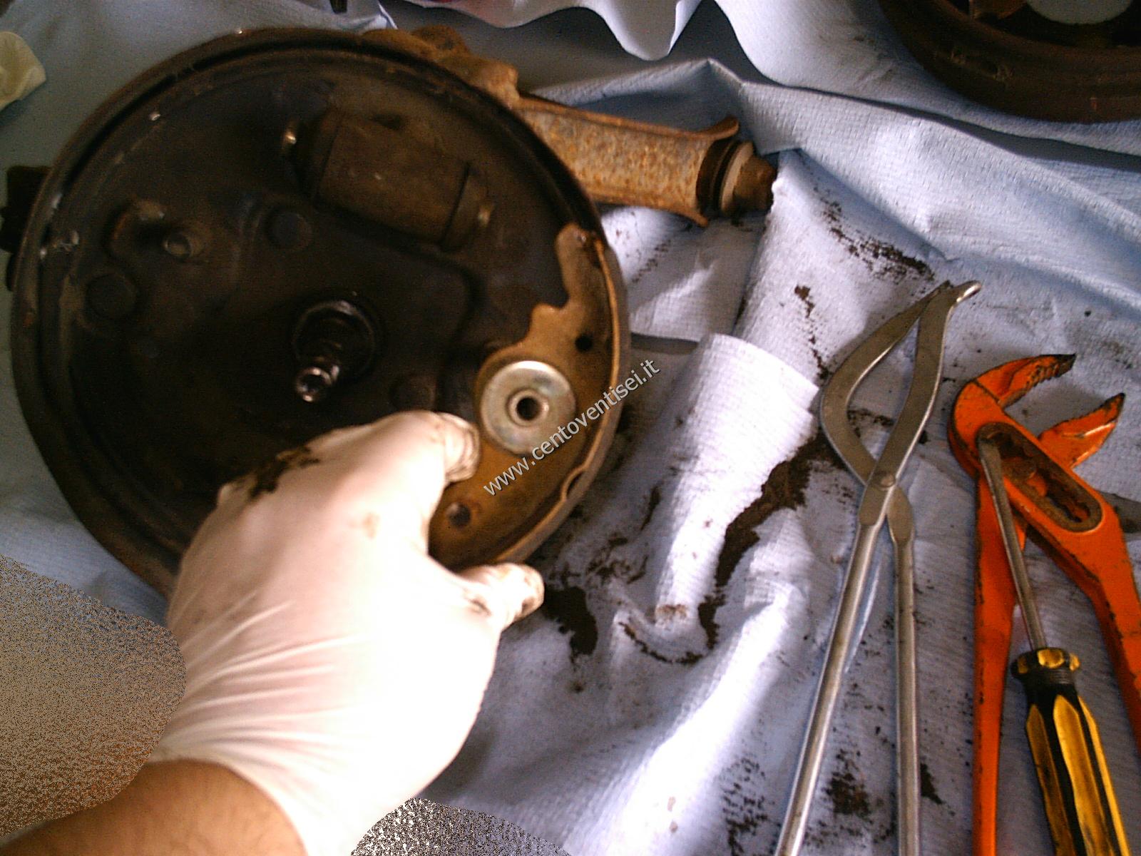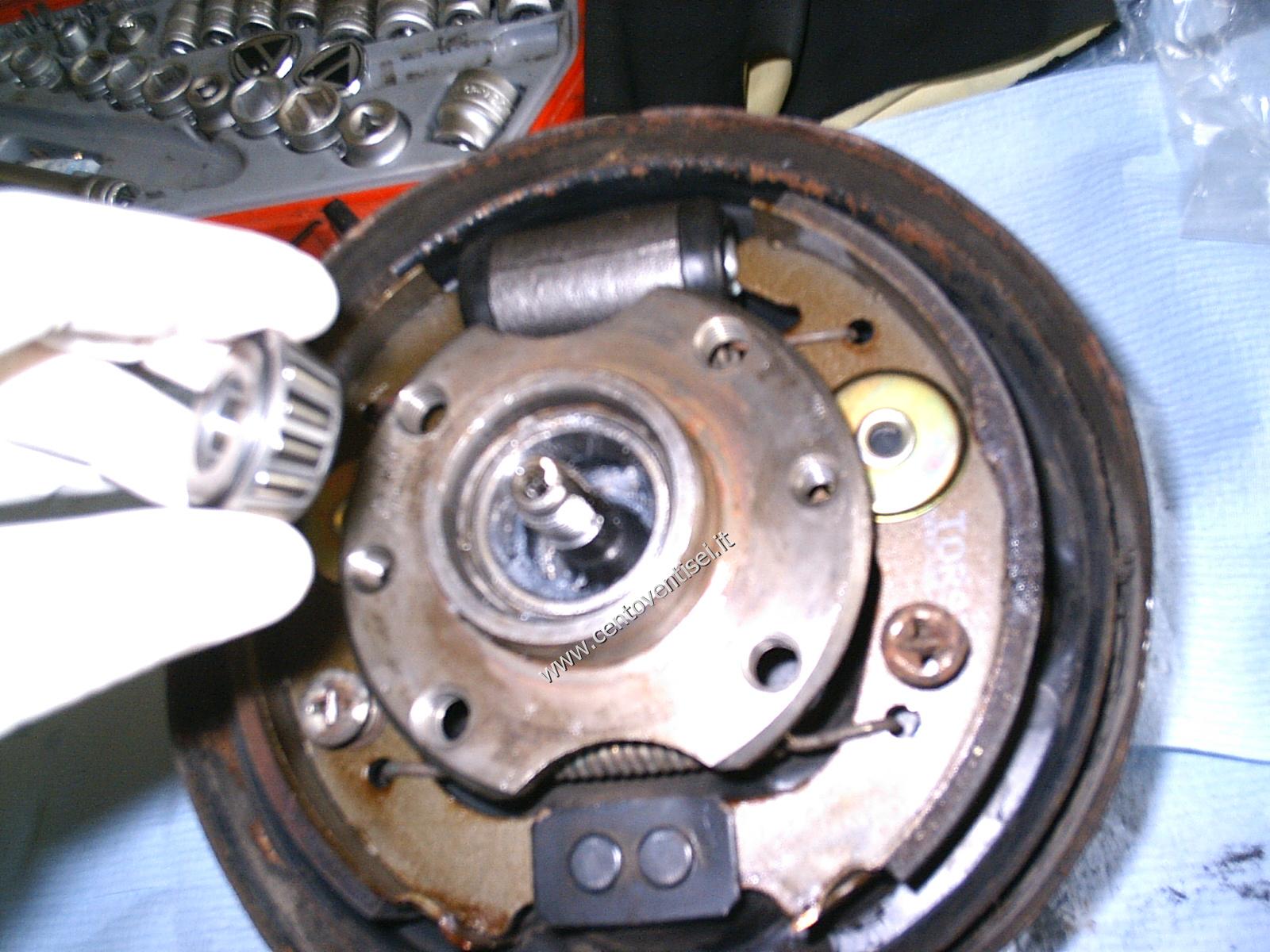 Togliamo il tamburo, fissato con 2 viti (chiave da 12mm). Ecco cosa vediamo.
