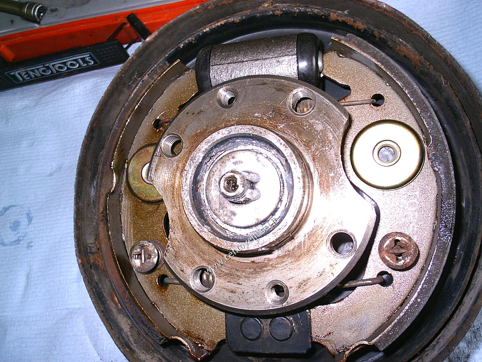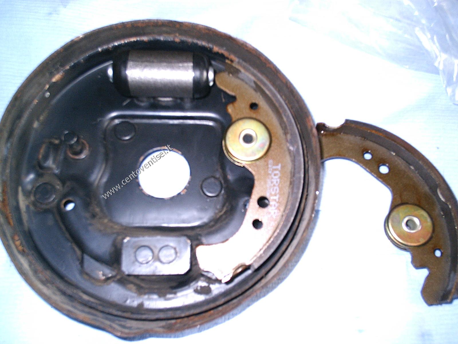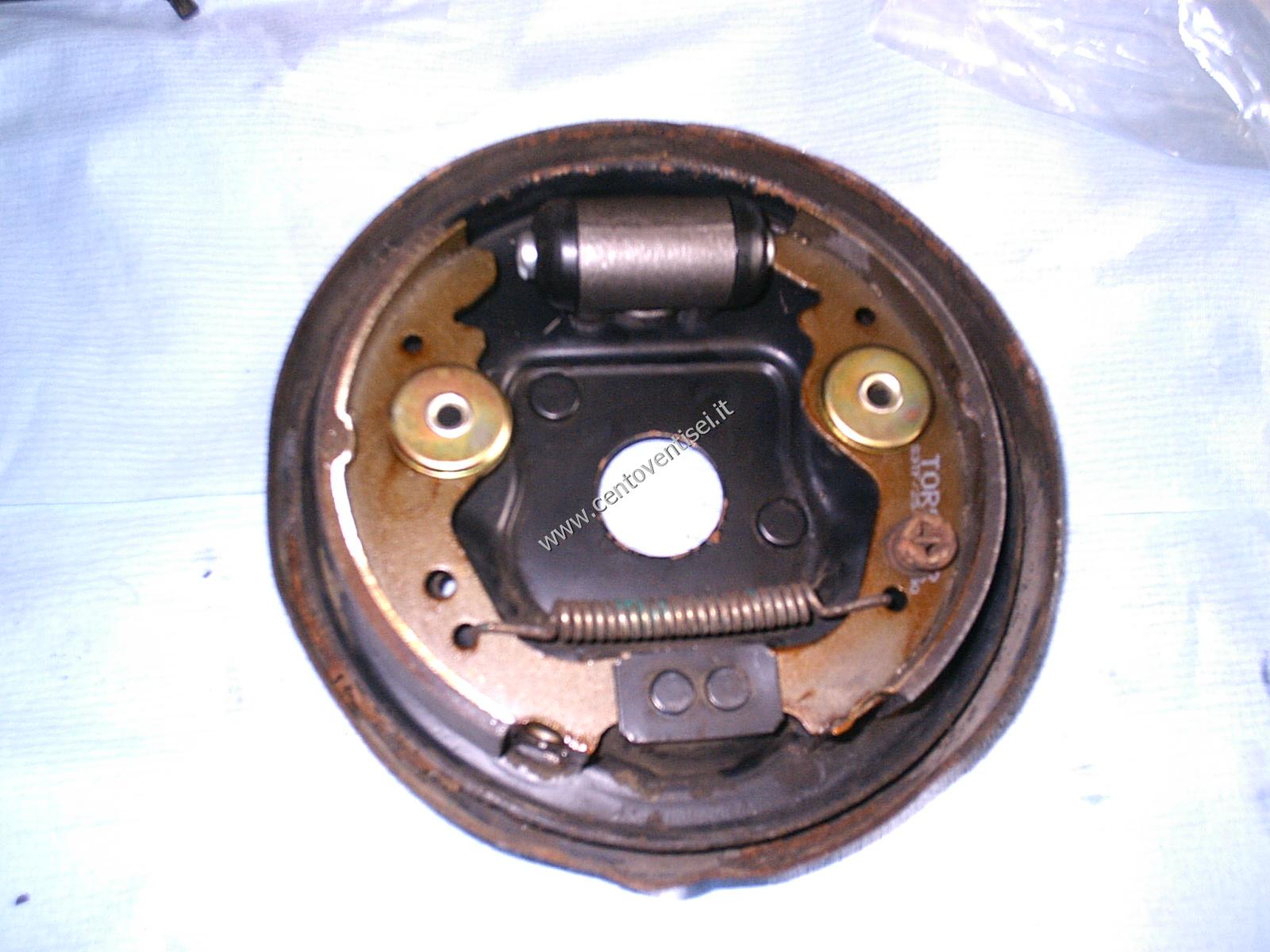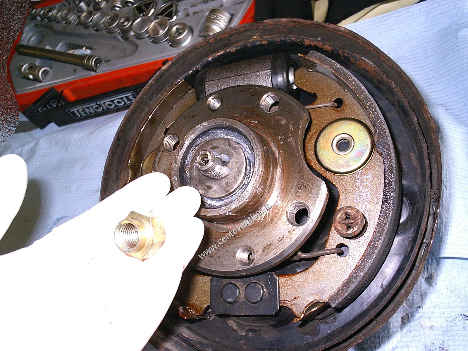 Togliamo il tamburo, fissato con 2 viti (chiave da 12mm). Ecco cosa vediamo.