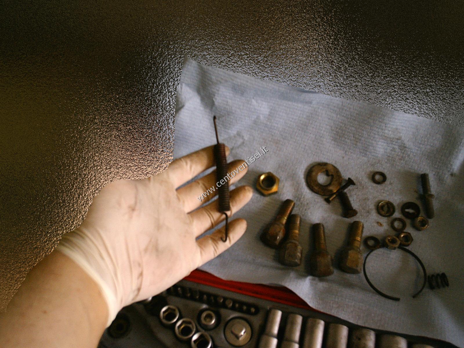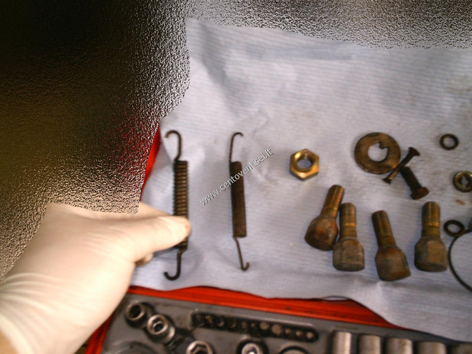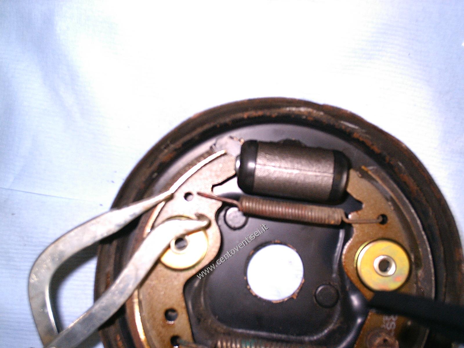 Togliamo la molla superiore delle ganasce, usiamo una pinza adeguata per evitare infortuni.