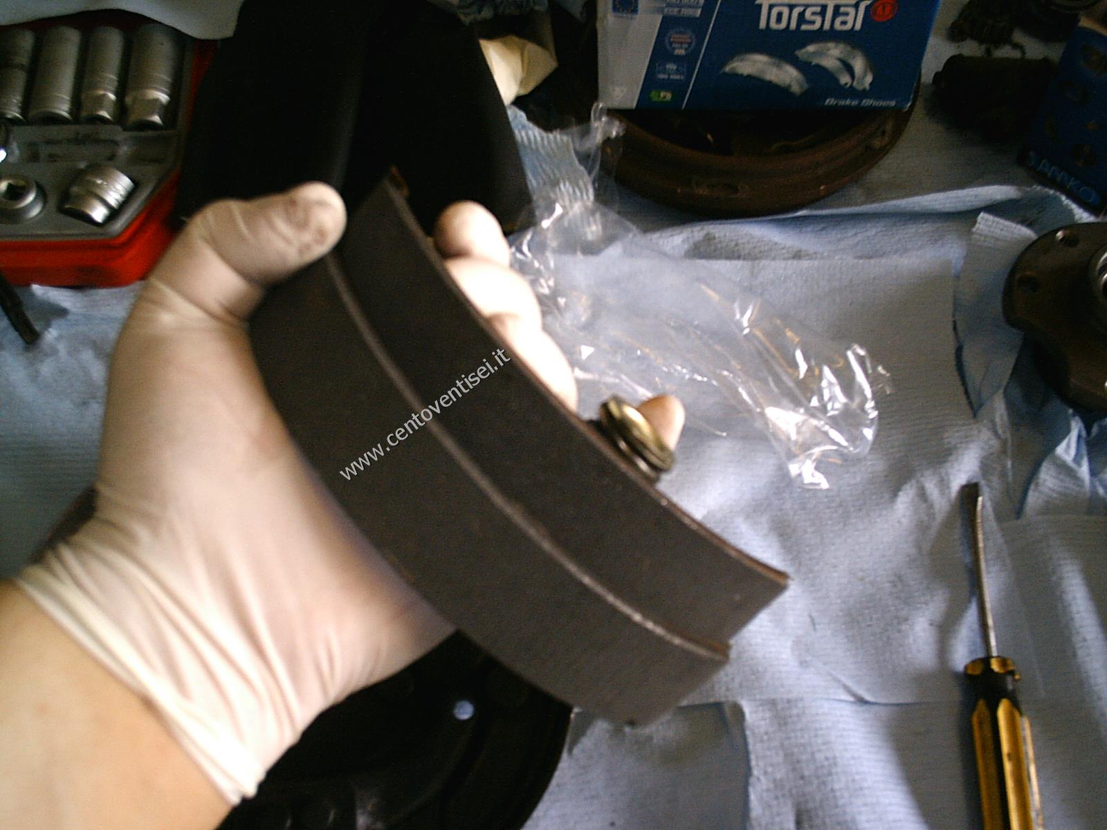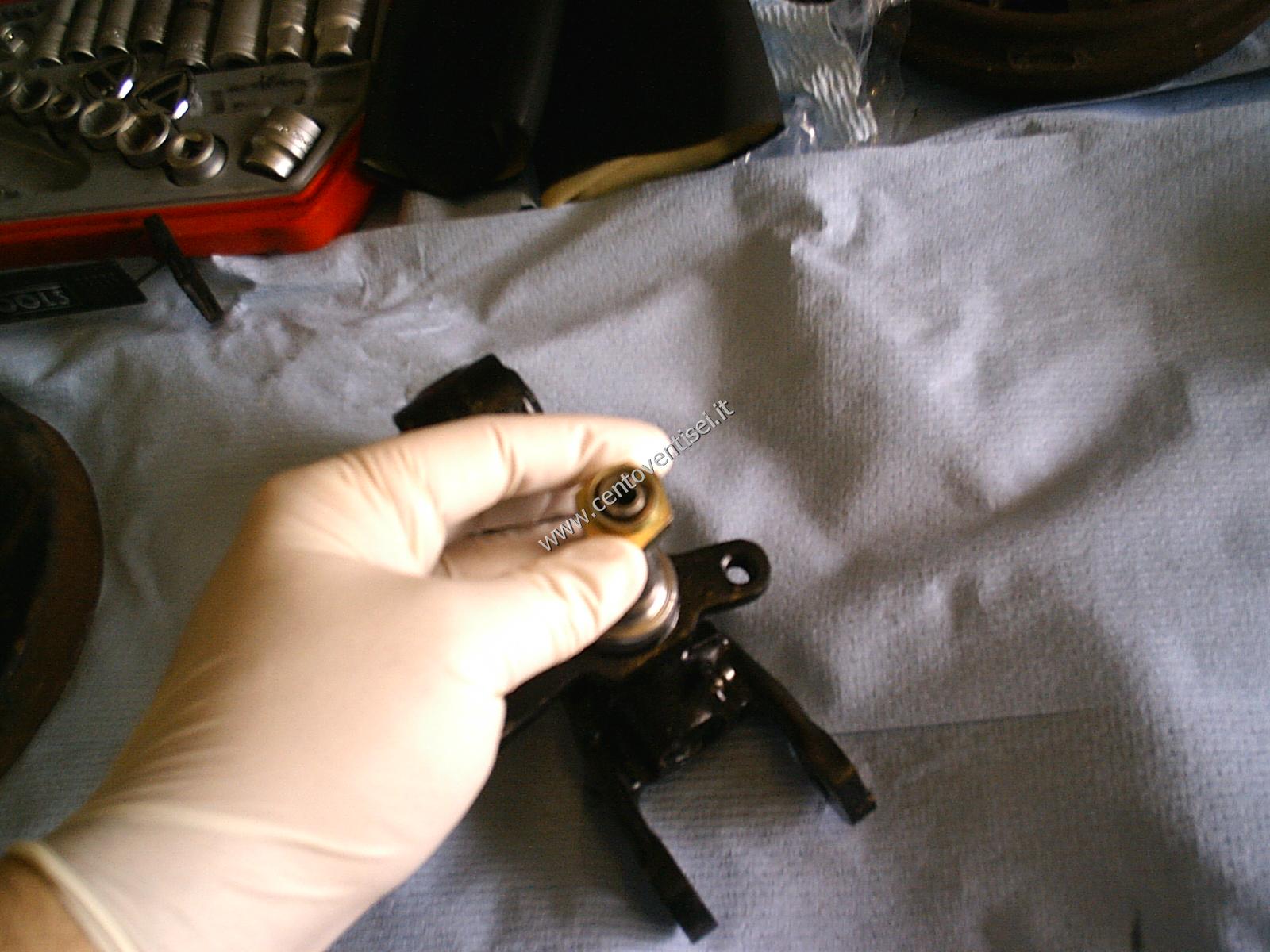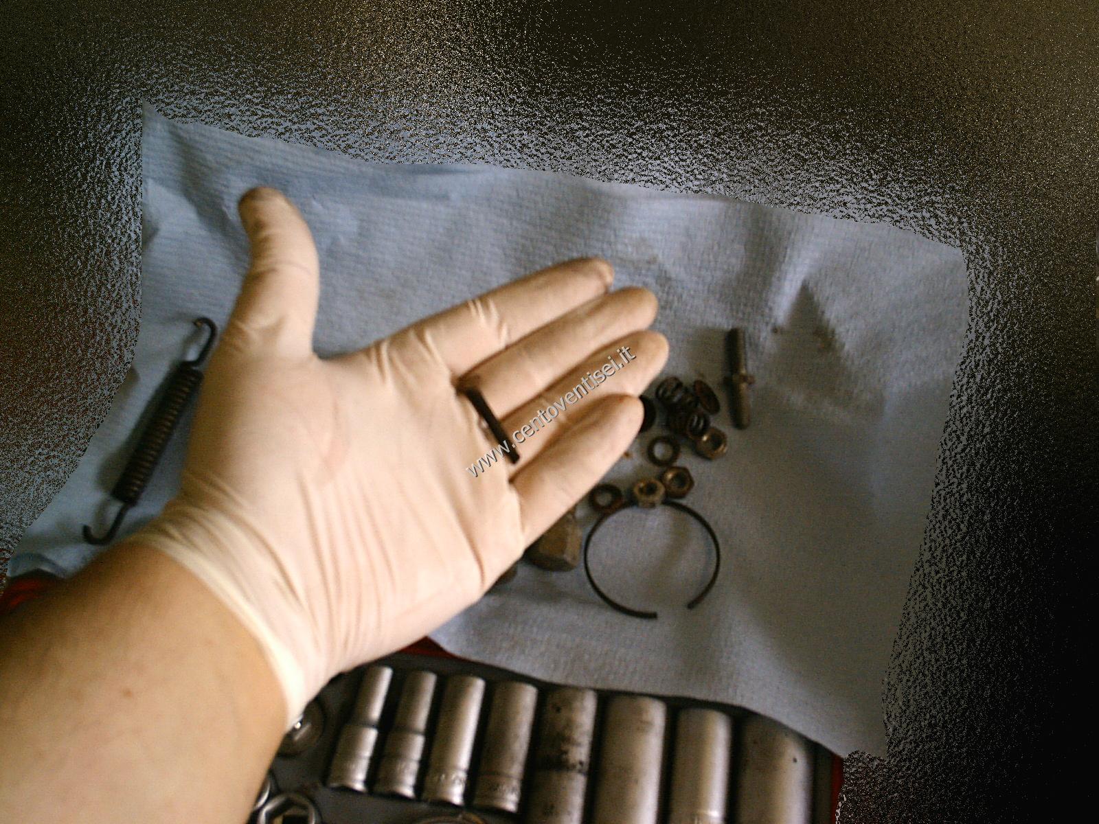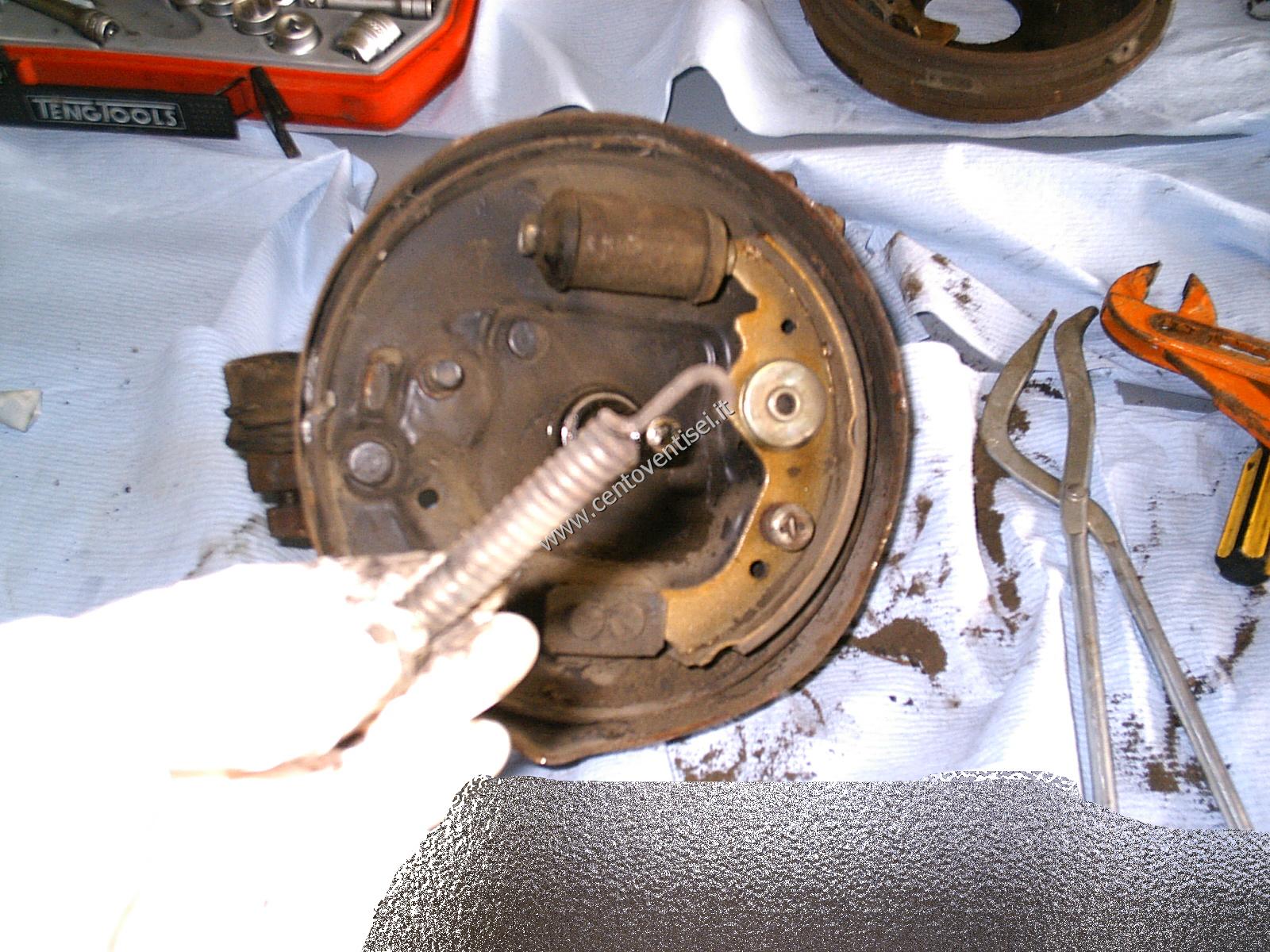 Togliamo la molla superiore delle ganasce, usiamo una pinza adeguata per evitare infortuni.