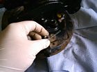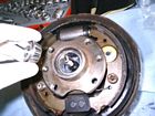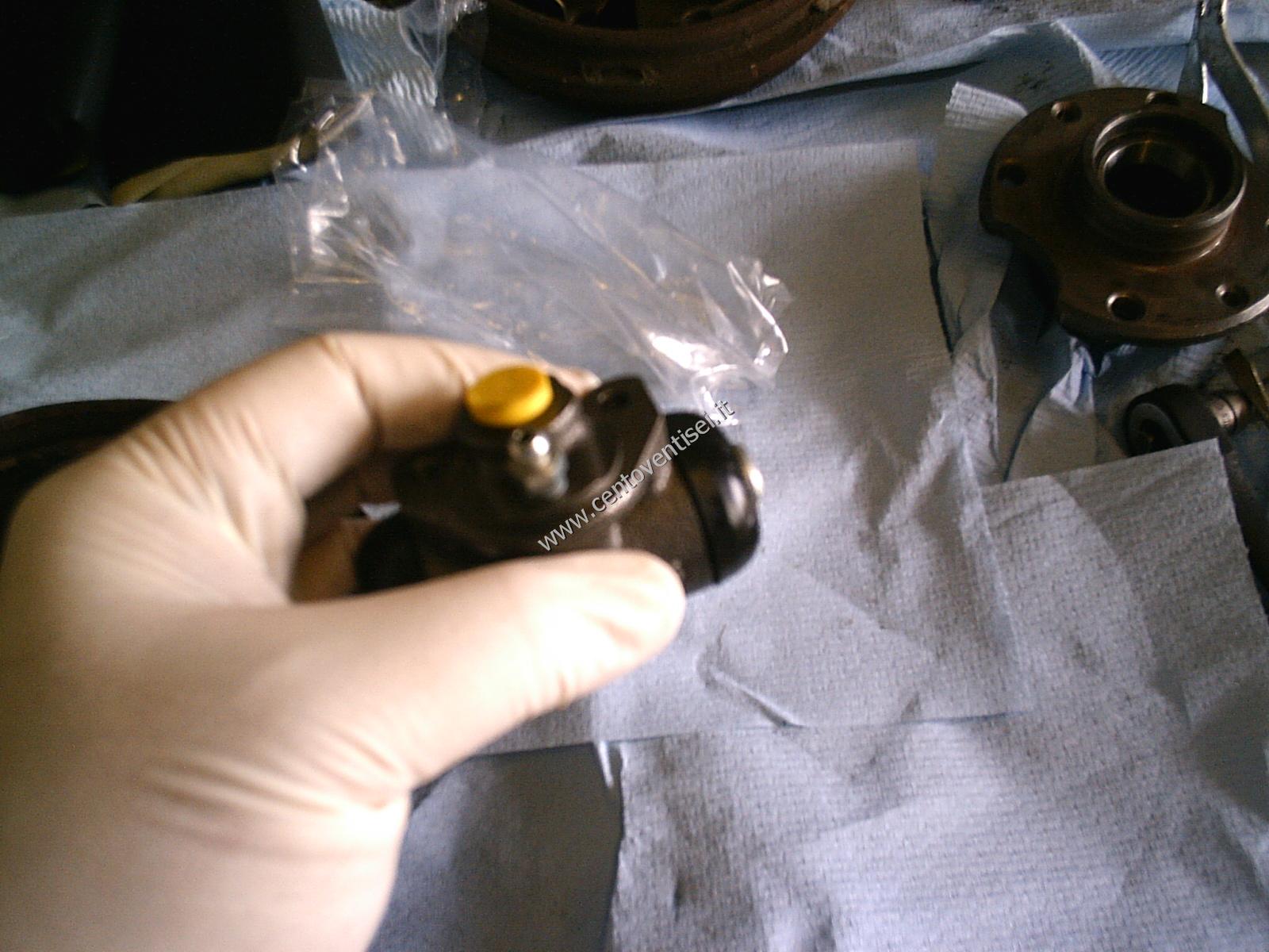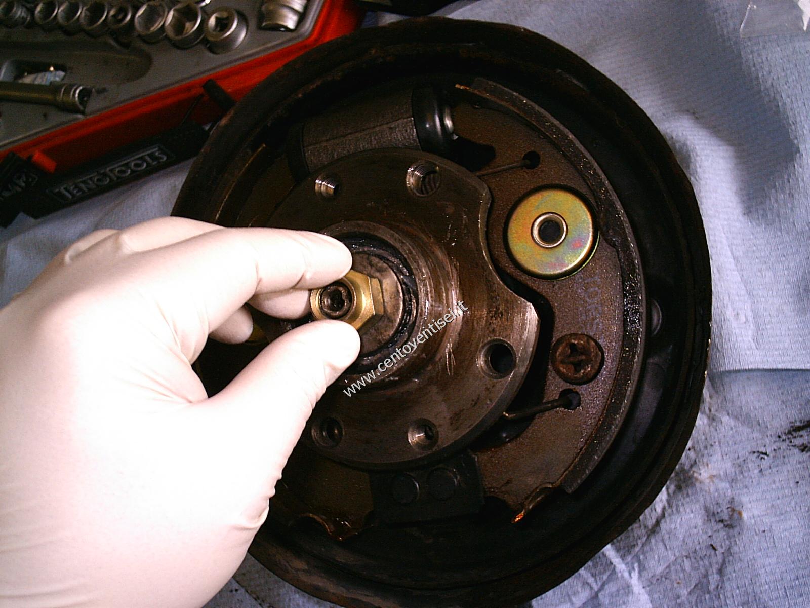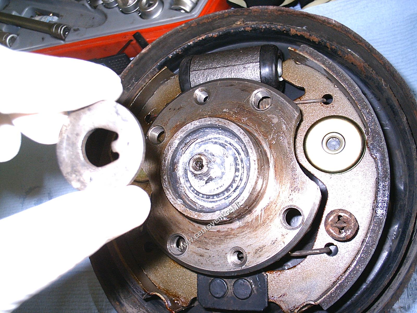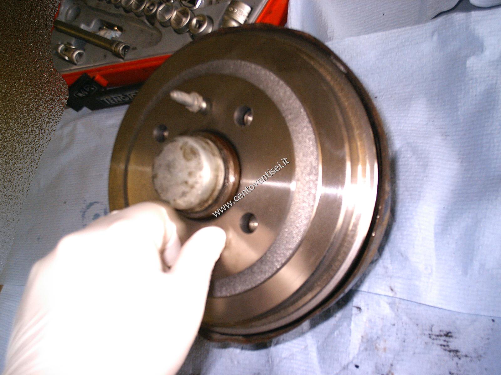 Riempire di grasso il tappo e posizionarlo. Posizionare il tamburo, se le ganasce interferiscono, dare piccoli colpi di martello per spostarle.