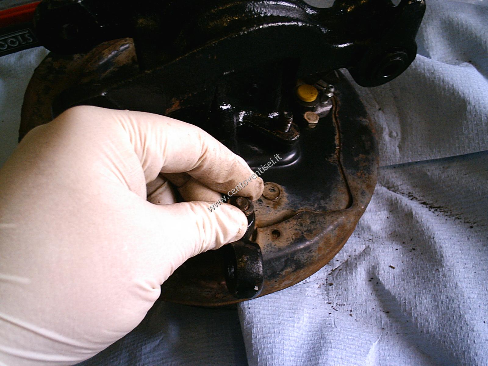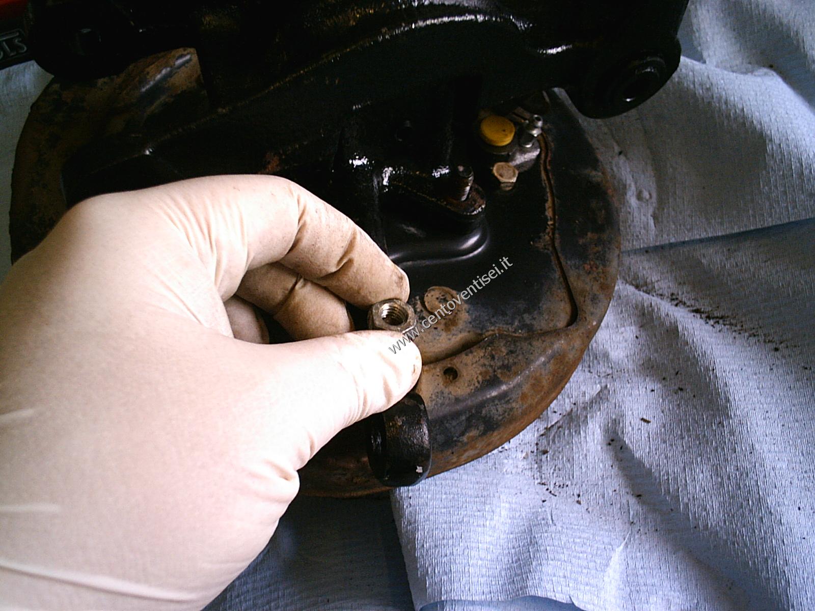 Svitiamo l'altra vite, che tiene anche la sicurezza del tubo dell'olio dei freni.