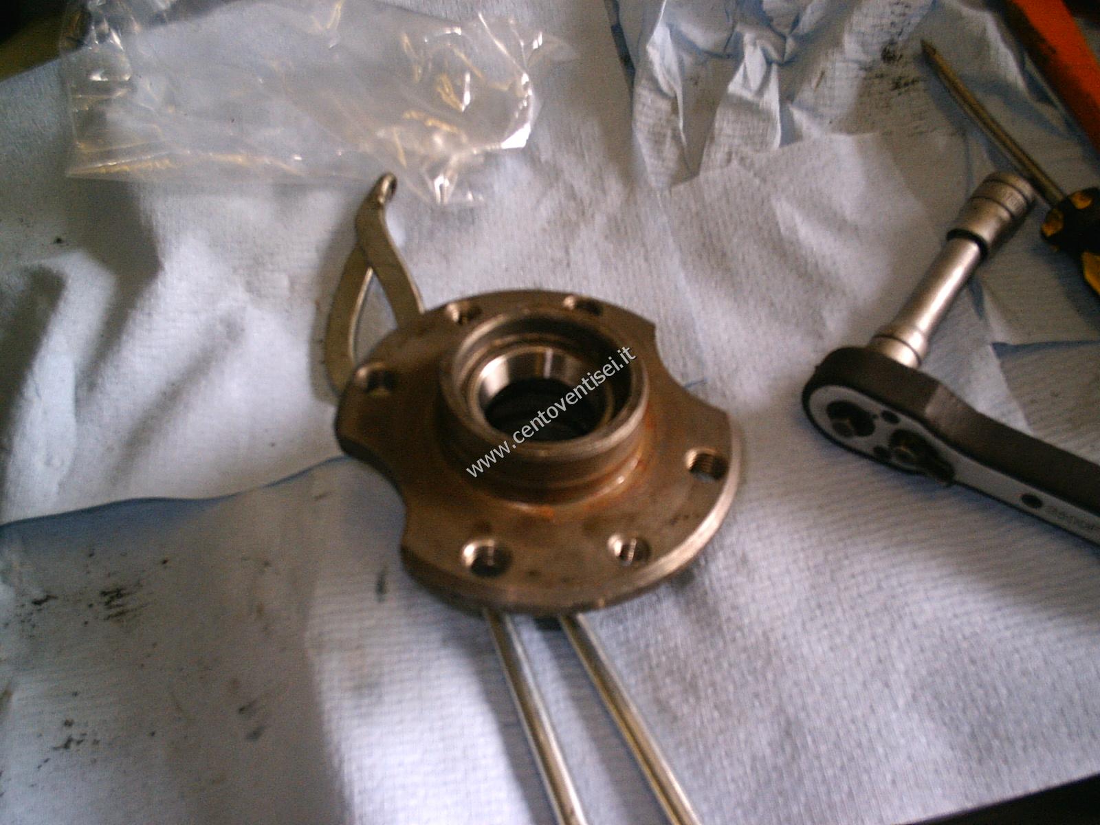 Il mozzo: restano da togliere i due anelli dei cuscinetti.